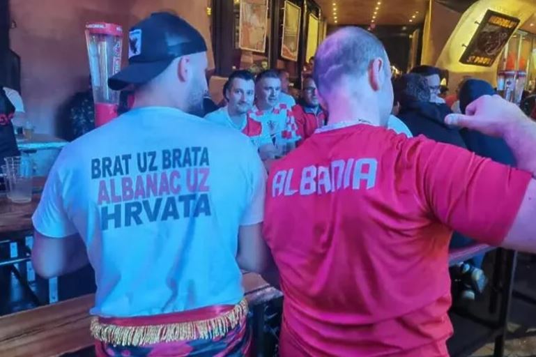 Денеска во Хамбург со почеток од 15:00 часот се игра евро-натпреварот од групата Б помеѓу Хрватска и Албанија, а пред натпреварот владее исклучително пријателска атмосфера меѓу навивачите на тие селекции. И додека претходните денови бевме сведоци на некои немили сцени од улиците на германските градови пред евро-игрите, пред дуелот меѓу Хрватска и Албанија, љубовта и пријателството се проширија низ Хамбург. Хрватите и Албанците од вчера пеат заедно по улиците и кафулињата и едвај чекаат да започне денешниот натпревар. Најмногу внимание привлече натписот на маичката „Брат со брат, Албанец со Хрват“ што ја носеше еден од албанските навивачи.