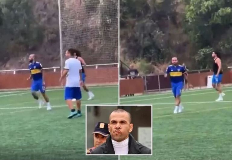 Поранешниот бразилски фудбалер Дани Алвеш извесно време е на условен отпуст откако плати еден милион евра за да излезе од затворот во Барселона, а сега за прв пат е снимен на фудбалски терен.