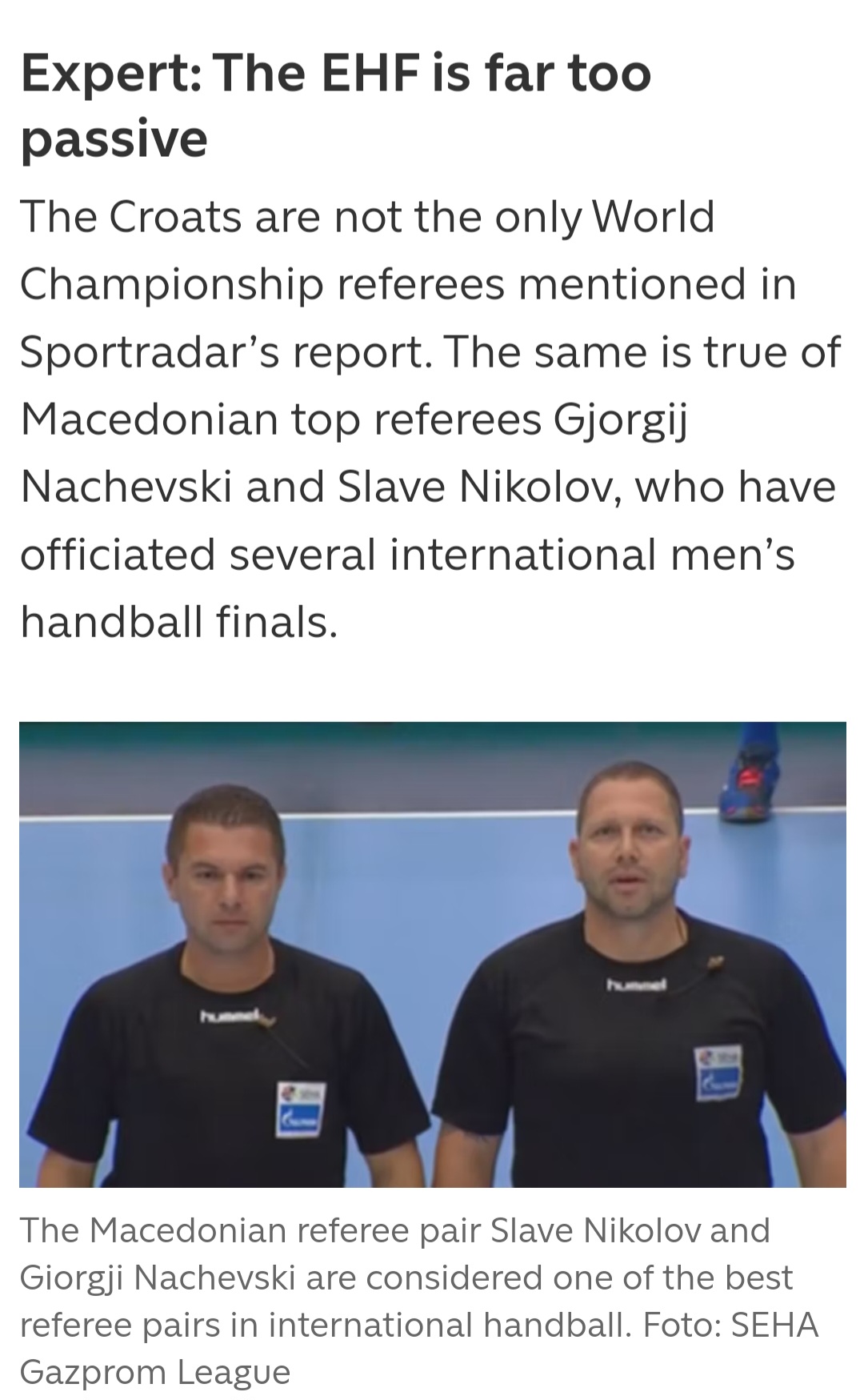 Данскиот медиум ТВ2, а повикувајќи се на извештајот на Спортрадар објави голем скандал со местење на ракометни мечеви, пред се во Лигата на шампионите. Што е уште поскандалозно за нас е тоа што вмешани во местењето биле и најдобритр македонски судии Славе Николов и Ѓорѓи Начески.