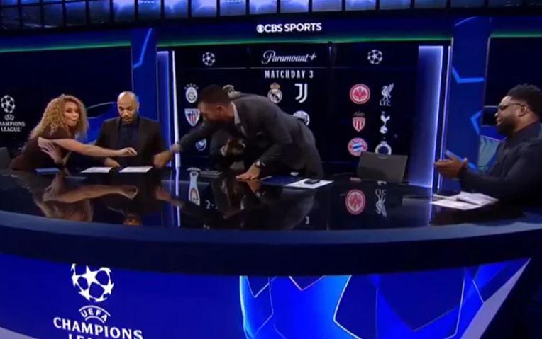 “Ми пукна горниот дел!” – извика таа со насмевка, додека нејзините ко-водители и легендарните фудбалери Тиери Анри, Џејми Карагер и Мика Ричардс започнаа да се смеат.