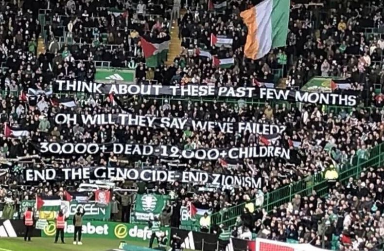 На вчерашниот натпревар против Килманрок, навивачите на шкотскиот гигант Селтик испратија порака за поддршка на Палестинците во војната против Израел. Тие ги позајмија стиховите на една од најголемите љубовни островски песни „Грејс“ и го повикаа целиот стадион да пее додека се креваше слоганот, што и го направија. „Размислете за последните неколку месеци, дали ќе кажат дека не успеавме, повеќе од 30.000 мртви од кои повеќе од 12.000 се деца. Стоп за геноцидот, стоп за ционизмот“, гласеше нивниот слоган.