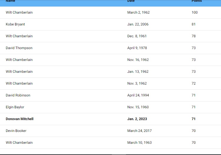 Кошаркарот на Кливленд кавалирс, Донован Мичел постигна 71 поен против Чикаго Булс (145:134,по продолжение) и стана седмиот играч во историјата на НБА кој постигнал над 70 поени на еден натпревар.