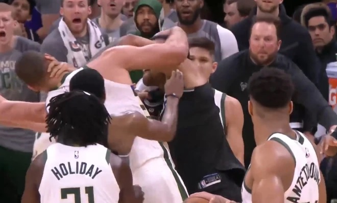 Веднаш, центарот на Бакс, Брук Лопез влета и почна голема гужва и грабнување за грлото. Сите играчи се втурнаа да ги разделат, што не можеше да биде така лесно